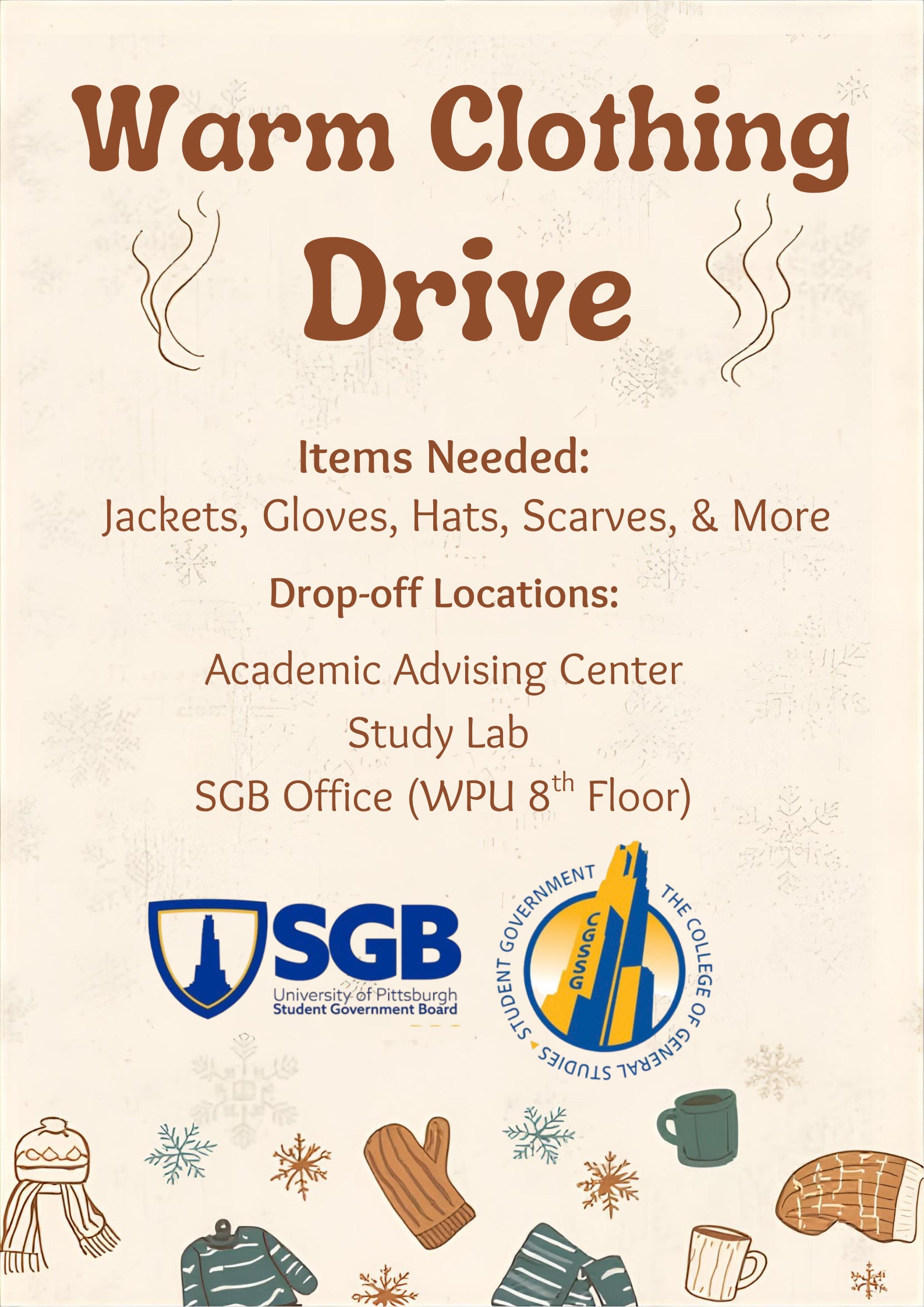 In collaboration with SGB, we're also having a warm clothing drive! If you have any items such as jackets, gloves, hats, and scarves, please consider donating these to support our Pitt community. Drop off locations for donations include the Academic Advising Center (201 Thackery Hall), the Study Lab, and SGB's office (WPU 8th floor). Download flyer.