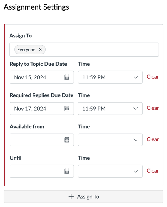 • In the Assign To section at the bottom of the page, two date fields now appear: one for the “Reply to Topic Due Date” (initial posts) and one for the “Required Replies Due Date” (peer responses).
