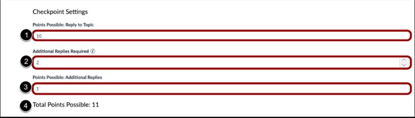 Figure 2. Checkpoint settings with separate fields for “Reply to Topic” and “Required Replies.” Screenshot from Ball State University Teaching Innovation Blog (Snider, 2024).