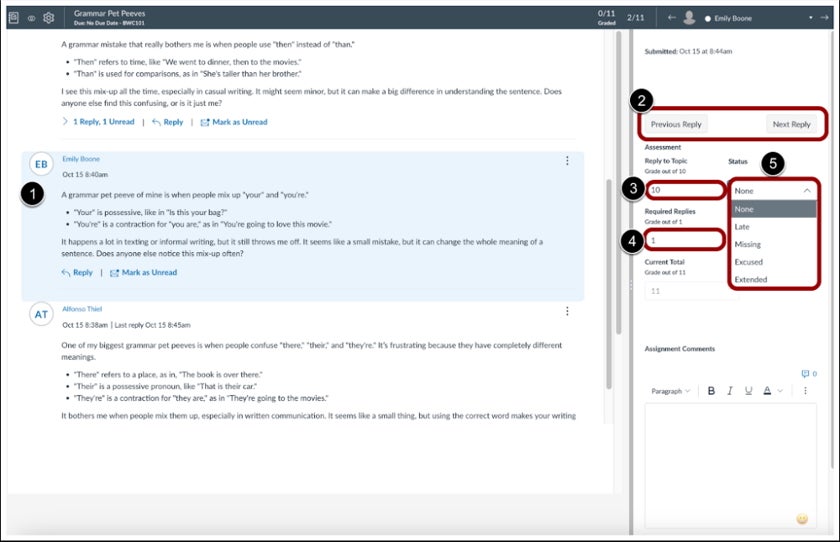 In SpeedGrader, each checkpoint displays its own grading field and status menu (e.g., Late, Missing). After you enter scores for posts and replies, Canvas automatically sums them into the Current Total. A single comments box remains available for overall feedback.